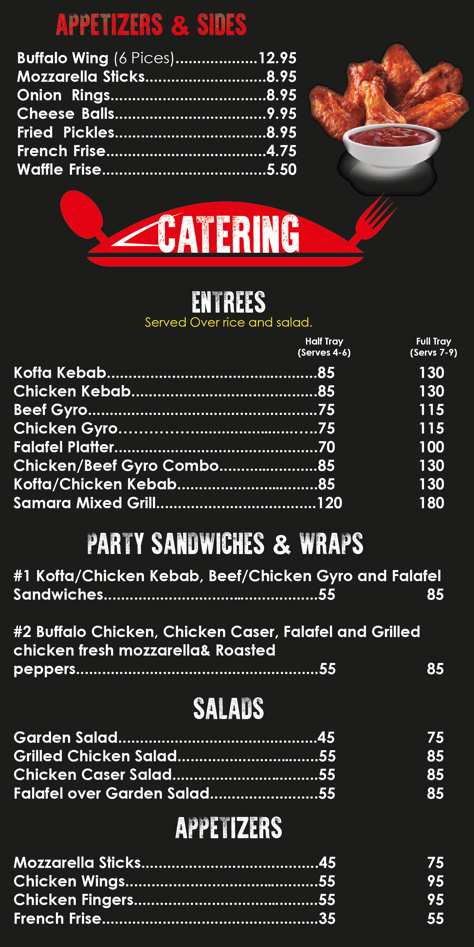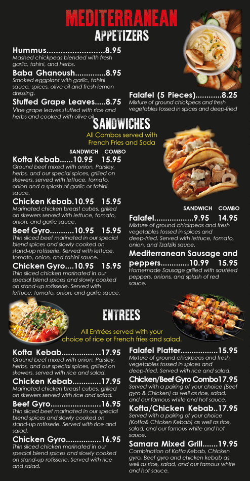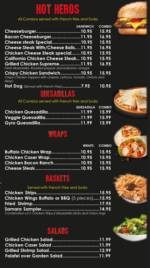 From a reviewer’s perspective, the menu at Samara Grill offers an impressively broad and satisfying selection that caters to both classic American cravings and Mediterranean favorites. The appetizer lineup, featuring Waffle Fries, French Fries, Buffalo Wings (6 Pieces), Mozzarella Sticks, and Onion Rings, provides familiar comfort options, while Mediterranean starters like Stuffed Grape Leaves, Hummus, Falafel (5 Pieces), and Baba Ghanoush add a flavorful, authentic touch. The variety continues with hearty baskets such as Chicken Wings Buffalo (5 Pieces), Chicken Wings BBQ (5 Pieces), Fried Shrimp, and Chicken Strips, alongside standout items like the Samara Sampler. Sandwich lovers can enjoy classics like the Cheeseburger, Bacon Cheeseburger, Hot Dog, and more unique offerings like the Chicken Cheesesteak Special and Cheese Steak With Cheese Balls. Mediterranean entrées such as the Chicken Kebab, Beef Gyro, Chicken & Beef Gyro Mix, and the Samara Mixed Grill highlight the kitchen’s strength, while wraps like the Buffalo Chicken Wrap, Chicken Caesar Wrap, and Chicken Bacon Ranch provide convenient, flavorful options. Breakfast items, including Bagel With Cream Cheese, Hash Browns, and omelettes like the Western Omelette or Vegetable Omelette, round out the menu nicely. Overall, the diverse offerings-from Falafel Platter to Grilled Chicken Salad-make Samara Grill a versatile spot where both variety and taste leave a lasting impression.