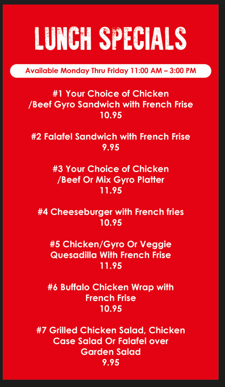 Combination of kofta kebab, chicken gyro, beef gyro and chicken kebab as well as rice, salad, and our famous white and hot sauce.